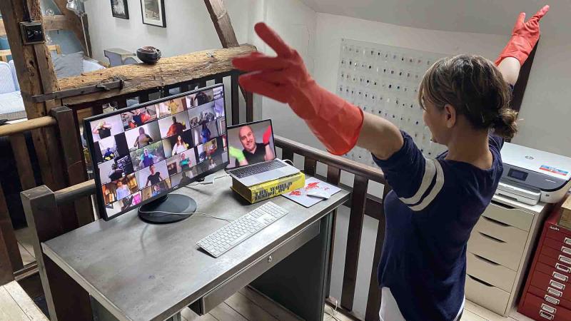 Before the meeting date, delegates are briefed to have colourful rubber gloves to hand. Participants join the activity with an online conferencing tool like zoom or Microsoft teams. They are introduced to the activity and embark on a series of body sound exercises guided by a charismatic conductor. Once introduced and warmed up, they put on their colourful washing gloves, or nearest equivalent improvised at home. The conductor then leads them up and out of their seats, stomping, body slapping and vocalising in unison. Energy levels are instantly raised, easing the path for productive communication in the meeting ahead. The activity can be extended to 20 minutes and will end in smiles and peals of laughter with participants enthused connected and ready to focus on the meeting ahead.